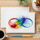 Artistically drawn infinity symbol with beautiful rainbow feather on white background. Tattoo style.