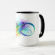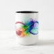 Artistically drawn infinity symbol with beautiful rainbow feather on white background. Tattoo style.