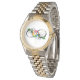 The watch is very nice, the picture is great and the watch looks like quality. The only problem I am having with it is that it is a little too large, and I also can't figure out how to open the clasp. No directions came with it. Very good. The printing is perfect and the watch keeps good time.