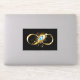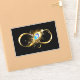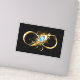 Gold, shiny symbol of infinity, decorated with jewellery peacock feather with turquoise on black background.