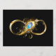 Gold, shiny symbol of infinity, decorated with jewellery peacock feather with turquoise on black background.