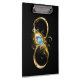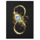 Gold, shiny symbol of infinity, decorated with jewellery peacock feather with turquoise on black background.