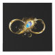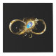 Gold, shiny symbol of infinity, decorated with jewellery peacock feather with turquoise on black background.