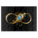 Gold, shiny symbol of infinity, decorated with jewellery peacock feather with turquoise on black background.
