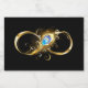 Gold, shiny symbol of infinity, decorated with jewellery peacock feather with turquoise on black background.