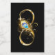 Gold, shiny symbol of infinity, decorated with jewellery peacock feather with turquoise on black background.