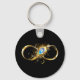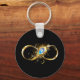 Gold, shiny symbol of infinity, decorated with jewellery peacock feather with turquoise on black background.