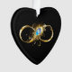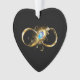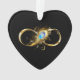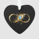 Gold, shiny symbol of infinity, decorated with jewellery peacock feather with turquoise on black background.