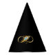 Gold, shiny symbol of infinity, decorated with jewellery peacock feather with turquoise on black background.