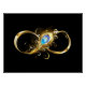 Gold, shiny symbol of infinity, decorated with jewellery peacock feather with turquoise on black background.