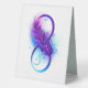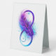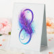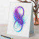 Infinity symbol with a beautiful feather painted in purple and blue bright colours on white background.