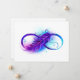 Infinity symbol with a beautiful feather painted in purple and blue bright colours on white background.