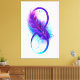 Infinity symbol with a beautiful feather painted in purple and blue bright colours on white background.