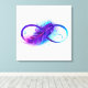Infinity symbol with a beautiful feather painted in purple and blue bright colours on white background.