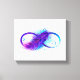 Infinity symbol with a beautiful feather painted in purple and blue bright colours on white background.