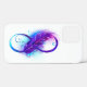 Infinity symbol with a beautiful feather painted in purple and blue bright colours on white background.
