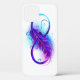 Infinity symbol with a beautiful feather painted in purple and blue bright colours on white background.