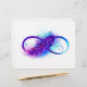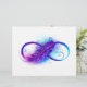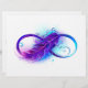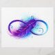 Infinity symbol with a beautiful feather painted in purple and blue bright colours on white background.
