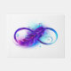 Infinity symbol with a beautiful feather painted in purple and blue bright colours on white background.