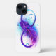 Infinity symbol with a beautiful feather painted in purple and blue bright colours on white background.