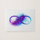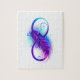 Infinity symbol with a beautiful feather painted in purple and blue bright colours on white background.