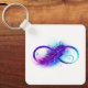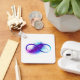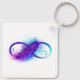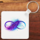 Infinity symbol with a beautiful feather painted in purple and blue bright colours on white background.