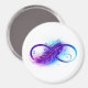 Infinity symbol with a beautiful feather painted in purple and blue bright colours on white background.