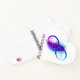Infinity symbol with a beautiful feather painted in purple and blue bright colours on white background.
