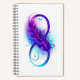 Infinity symbol with a beautiful feather painted in purple and blue bright colours on white background.