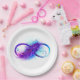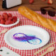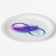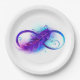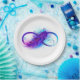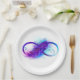 Infinity symbol with a beautiful feather painted in purple and blue bright colours on white background.
