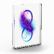 Infinity symbol with a beautiful feather painted in purple and blue bright colours on white background.