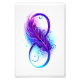 Infinity symbol with a beautiful feather painted in purple and blue bright colours on white background.