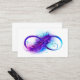 Infinity symbol with a beautiful feather painted in purple and blue bright colours on white background.