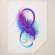 Infinity symbol with a beautiful feather painted in purple and blue bright colours on white background.