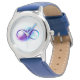 Infinity symbol with a beautiful feather painted in purple and blue bright colours on white background.