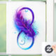 Infinity symbol with a beautiful feather painted in purple and blue bright colours on white background.