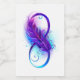 Infinity symbol with a beautiful feather painted in purple and blue bright colours on white background.