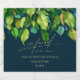 Creative wedding design featuring abundant foliage hand-drawn in a modern manner imitating metallic texture. Shades of green, gold, copper, platinum, turquoise, dark blue. Deep blue background. Infused With Love, trendy signature font. Gold lettering (gold is not real gold but colour). Modern streamlined fonts. Truly unique, involving, and elegant. For fall wedding, summer wedding, garden wedding, or any kind of modern elegant wedding.