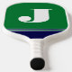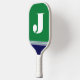 This monogrammed pickleball paddle is simple, modern, minimal but bold and colourful with its green and navy blue stripes and your first or last initial in white.