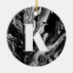Simple, stylish custom initial letter monogram tree ornament with a black and white ink marble swirl pattern and modern minimalist typography in white. this personalised Christmas ornament makes the perfect customised holiday gift and thoughtful home decor accessory.