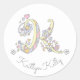 Pretty girls monogram name sticker ideal for embellishing books and to personalised girls items. Stickers reads K Kaitlyn Kelly or you can personalise with your own name or surname starting in K. Decorative capital letter K with hearts and flowers art © Designed by Sarah Trett www.sarahtrett.com for www.mylittleeden.com