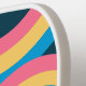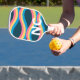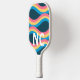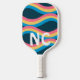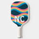 Retro waves in vibrant pink, yellow, and light blue on a dark blue background. Your initials are displayed in white and large format near the handle. Have fun at your next pickleball game with this cheerful and colourful design!