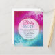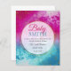 A budget baby shower or gender reveal invitation. On a blue and pink ink splash background, a white transparent circle, surrounded by gold rings and glitter, contains the baby's surname within typography text. Personalise by adding your full event and contact details to the front and back.