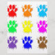 A colourful pattern of dog paw prints with ink splatter effect.