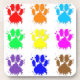 A colourful pattern of dog paw prints with ink splatter effect.