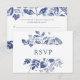 This lovely and stylish botanical wedding response card features trendy blue ink leaves on a white background.