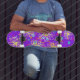The combination of the purple backdrop, intricate floral patterns, and splashes of paint creates a visually stunning piece that is sure to turn heads at the skate park or on the streets. It's not just a skateboard, it's a statement of style and creativity.