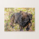 A brindle coloured puppy looks at the camera with innocent puppy eyes. If you love puppies, our "Innocent Brindle Puppy Jigsaw Puzzle" is perfect for you. Order yours today!