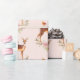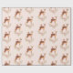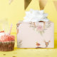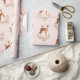 Wrapping paper with a pattern of an image of a beautiful brown doe with white spots on her fur. A cute bird sitting on the deer's back. An elegant flower arrangement composed of watercolor roses and light green leaves. A peach coloured background along the bottom. Darling and adorable design.