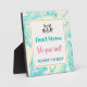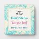 A cool inspirational saying which says: Don't Stress, Do your best, forget the rest. With a cute and happy smiling cat face. The background is a swirly paint marble texture in turquoise blue and cream colors.